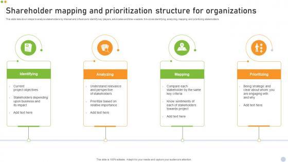 This slide lists down steps to analyze stakeholders by interest and influence to identify key players, advocates and time-wasters. It involves identifying, analyzing, mapping and prioritizing stakeholders. Showcasing this set of slides titled Shareholder Mapping And Prioritization Structure For Organizations Microsoft Pdf. The topics addressed in these templates are Identifying, Analyzing, Mapping, Prioritizing. All the content presented in this PPT design is completely editable. Download it and make adjustments in color, background, font etc. as per your unique business setting. This slide lists down steps to analyze stakeholders by interest and influence to identify key players, advocates and time-wasters. It involves identifying, analyzing, mapping and prioritizing stakeholders.