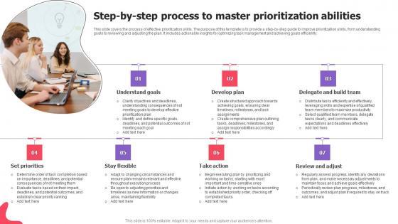 This slide covers the process of effective prioritization skills. The purpose of this template is to provide a step-by-step guide to improve prioritization skills, from understanding goals to reviewing and adjusting the plan. It includes actionable insights for optimizing task management and achieving goals efficiently. Showcasing this set of slides titled Step By Step Process To Master Prioritization Abilities Topics Pdf The topics addressed in these templates are Understand Goals, Develop Plan, Delegate And Build Team All the content presented in this PPT design is completely editable. Download it and make adjustments in color, background, font etc. as per your unique business setting. This slide covers the process of effective prioritization skills. The purpose of this template is to provide a step-by-step guide to improve prioritization skills, from understanding goals to reviewing and adjusting the plan. It includes actionable insights for optimizing task management and achieving goals efficiently.