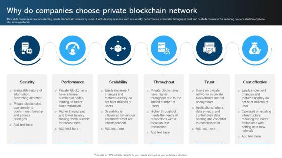 This slide covers reasons for selecting private blockchain network by users. It includes key reasons such as security, performance, scalability, throughput, trust and cost effectiveness for ensuring proper selection of private blockchain network. Find a pre-designed and impeccable Comprehensive Manual For Blockchain Why Do Companies Choose Private BCT SS V. The templates can ace your presentation without additional effort. You can download these easy-to-edit presentation templates to make your presentation stand out from others. So, what are you waiting for Download the template from Slidegeeks today and give a unique touch to your presentation. This slide covers reasons for selecting private blockchain network by users. It includes key reasons such as security, performance, scalability, throughput, trust and cost effectiveness for ensuring proper selection of private blockchain network.