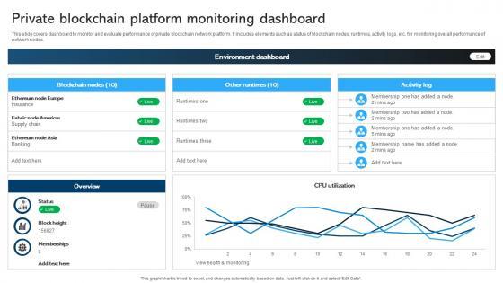 This slide covers dashboard to monitor and evaluate performance of private blockchain network platform. It includes elements such as status of blockchain nodes, runtimes, activity logs, etc. for monitoring overall performance of network nodes. Want to ace your presentation in front of a live audience Our Comprehensive Manual For Private Blockchain Platform Monitoring Dashboard BCT SS V can help you do that by engaging all the users towards you. Slidegeeks experts have put their efforts and expertise into creating these impeccable powerpoint presentations so that you can communicate your ideas clearly. Moreover, all the templates are customizable, and easy-to-edit and downloadable. Use these for both personal and commercial use. This slide covers dashboard to monitor and evaluate performance of private blockchain network platform. It includes elements such as status of blockchain nodes, runtimes, activity logs, etc. for monitoring overall performance of network nodes.