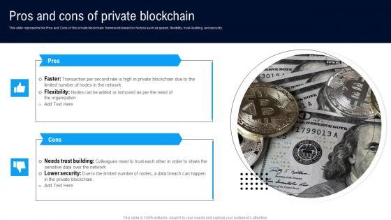 This slide represents the Pros and cons of the private blockchain framework based on factors such as speed, flexibility, trust-building, and security. Here you can discover an assortment of the finest PowerPoint and Google Slides templates. With these templates, you can create presentations for a variety of purposes while simultaneously providing your audience with an eye-catching visual experience. Download Pros And Cons Of Private Blockchain Involving Cryptographic Ledger To Enhance Introduction PDF to deliver an impeccable presentation. These templates will make your job of preparing presentations much quicker, yet still, maintain a high level of quality. Slidegeeks has experienced researchers who prepare these templates and write high-quality content for you. Later on, you can personalize the content by editing the Pros And Cons Of Private Blockchain Involving Cryptographic Ledger To Enhance Introduction PDF.