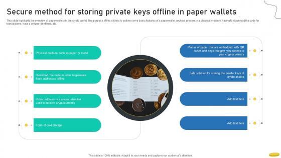 This slide highlights the overview of paper wallets in the crypto world. The purpose of this slide is to outline some basic features of a paper wallet such as present in a physical medium, having to download the code for transactions, have a unique identifiers, etc.Whether you have daily or monthly meetings, a brilliant presentation is necessary. Secure Method For Storing Private Keys Offline In Paper Cryptocurrency Management With Blockchain can be your best option for delivering a presentation. Represent everything in detail using Secure Method For Storing Private Keys Offline In Paper Cryptocurrency Management With Blockchain and make yourself stand out in meetings. The template is versatile and follows a structure that will cater to your requirements. All the templates prepared by Slidegeeks are easy to download and edit. Our research experts have taken care of the corporate themes as well. So, give it a try and see the results. This slide highlights the overview of paper wallets in the crypto world. The purpose of this slide is to outline some basic features of a paper wallet such as present in a physical medium, having to download the code for transactions, have a unique identifiers, etc.