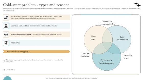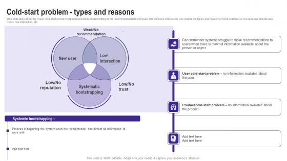 This slide talks about the major cold-start problem experienced while implementing some recommendation techniques. The purpose of this slide is to outline the types and reasons of cold-start issue. The reasons include new users, low interaction, etc. Make sure to capture your audiences attention in your business displays with our gratis customizable Recommender System Implementation Cold Start Problem Types And Reasons Mockup Pdf. These are great for business strategies, office conferences, capital raising or task suggestions. If you desire to acquire more customers for your tech business and ensure they stay satisfied, create your own sales presentation with these plain slides. This slide talks about the major cold-start problem experienced while implementing some recommendation techniques. The purpose of this slide is to outline the types and reasons of cold-start issue. The reasons include new users, low interaction, etc.