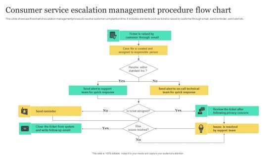 This slide showcase flowchart of escalation management process to resolve customer complaint on time. It includes elements such as ticket is raised by customer through email, send reminder, send alert etc. Showcasing this set of slides titled Consumer Service Escalation Management Procedure Flow Chart Portrait Pdf. The topics addressed in these templates are Consumer Service Escalation, Management Procedure, Flow Chart, Customer Through Email. All the content presented in this PPT design is completely editable. Download it and make adjustments in color, background, font etc. as per your unique business setting. This slide showcase flowchart of escalation management process to resolve customer complaint on time. It includes elements such as ticket is raised by customer through email, send reminder, send alert etc.