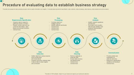This slide showcases the data analysis process to derive useful information and insights . It includes data requirement specification, data collection, data processing, data cleaning, data analysis and communication. Presenting Procedure Of Evaluating Data To Establish Business Strategy Clipart PDF to dispense important information. This template comprises six stages. It also presents valuable insights into the topics including Data Processing, Data Analysis, Data Cleaning. This is a completely customizable PowerPoint theme that can be put to use immediately. So, download it and address the topic impactfully.