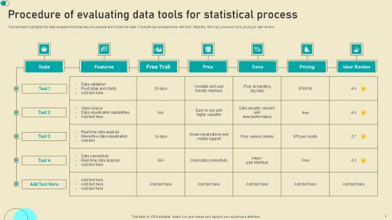 This template highlights the data analysis tools that allow to analyze and model the data. It include key analysis tools with their ,features, free trail, pros and cons ,pricing and user review. Pitch your topic with ease and precision using this Procedure Of Evaluating Data Tools For Statistical Process Professional PDF. This layout presents information on Data Visualization Capabilities, Data Analysis, Data Connectivity. It is also available for immediate download and adjustment. So, changes can be made in the color, design, graphics or any other component to create a unique layout.
