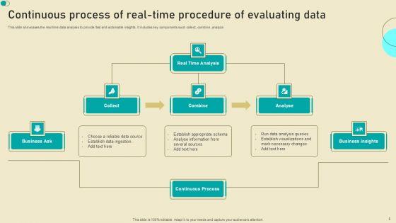 This slide showcases the real time data analysis to provide fast and actionable insights. It includes key components such collect, combine ,analyze. Showcasing this set of slides titled Continuous Process Of Real Time Procedure Of Evaluating Data Slides PDF. The topics addressed in these templates are Analyse, Business Insights, Continuous Process. All the content presented in this PPT design is completely editable. Download it and make adjustments in color, background, font etc. as per your unique business setting.