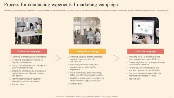The following slide showcases steps which can guide marketers to initiate experiential marketing campaign. It provides details about marketing goals, trends, omnichannel, logistics, advertising, brand mentions, social sharing, etc. Find a pre-designed and impeccable Process For Conducting Experiential Marketing Experiential Marketing Technique Rules PDF. The templates can ace your presentation without additional effort. You can download these easy-to-edit presentation templates to make your presentation stand out from others. So, what are you waiting for Download the template from Slidegeeks today and give a unique touch to your presentation. The following slide showcases steps which can guide marketers to initiate experiential marketing campaign. It provides details about marketing goals, trends, omnichannel, logistics, advertising, brand mentions, social sharing, etc.