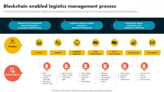 This slide showcases the blockchain enabled logistics management process highlighting how blockchain caters at each stage. Process includes key parties involved and corresponding deliverables. Whether you have daily or monthly meetings, a brilliant presentation is necessary. Blockchain Enabled Logistics Management Process Supply Chain Evolution Harnessing The Power BCT SS V can be your best option for delivering a presentation. Represent everything in detail using Blockchain Enabled Logistics Management Process Supply Chain Evolution Harnessing The Power BCT SS V and make yourself stand out in meetings. The template is versatile and follows a structure that will cater to your requirements. All the templates prepared by Slidegeeks are easy to download and edit. Our research experts have taken care of the corporate themes as well. So, give it a try and see the results. This slide showcases the blockchain enabled logistics management process highlighting how blockchain caters at each stage. Process includes key parties involved and corresponding deliverables.