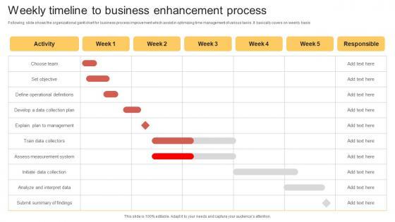 Following slide shows the organizational gantt chart for business process improvement which assist in optimizing time management of various tasks. It basically covers on weekly basis Pitch your topic with ease and precision using this Weekly Timeline To Business Enhancement Process Professional Pdf. This layout presents information on Responsible, Activity, Process . It is also available for immediate download and adjustment. So, changes can be made in the color, design, graphics or any other component to create a unique layout. Following slide shows the organizational gantt chart for business process improvement which assist in optimizing time management of various tasks. It basically covers on weekly basis