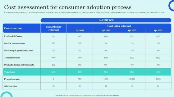 This slide provides glimpse about analyzing annual costs incurred in the consumer adoption process. It includes costs such as product R D costs, market research costs, marketing promotional costs, tradeshow costs, etc. Get a simple yet stunning designed Cost Assessment For Consumer Adoption Process Overview Of Customer Adoption Process Demonstration Pdf. It is the best one to establish the tone in your meetings. It is an excellent way to make your presentations highly effective. So, download this PPT today from Slidegeeks and see the positive impacts. Our easy to edit Cost Assessment For Consumer Adoption Process Overview Of Customer Adoption Process Demonstration Pdf can be your go to option for all upcoming conferences and meetings. So, what are you waiting for Grab this template today. This slide provides glimpse about analyzing annual costs incurred in the consumer adoption process. It includes costs such as product R D costs, market research costs, marketing promotional costs, tradeshow costs, etc.