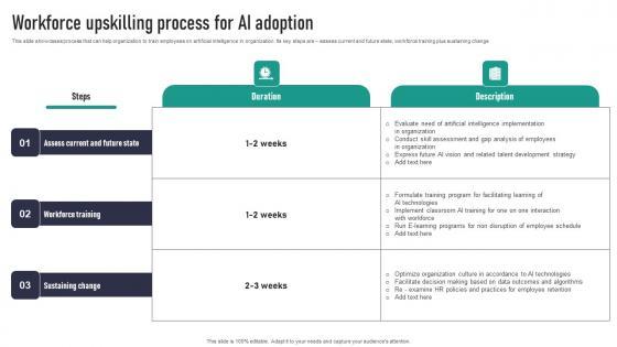 This slide showcases process that can help organization to train employees on artificial intelligence in organization. Its key steps are assess current and future state, workforce training plus sustaining change. There are so many reasons you need a Workforce Upskilling Process For AI Adoption Designs Pdf. The first reason is you can not spend time making everything from scratch, Thus, Slidegeeks has made presentation templates for you too. You can easily download these templates from our website easily. This slide showcases process that can help organization to train employees on artificial intelligence in organization. Its key steps are assess current and future state, workforce training plus sustaining change.