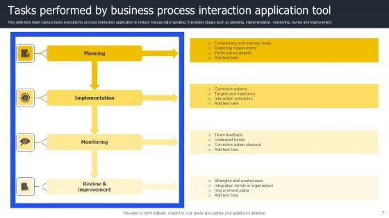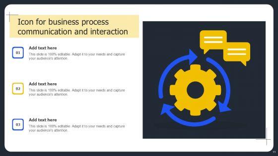 Improve your presentation delivery using this Business Process Interaction Ppt PowerPoint Presentation Complete Deck With Slides. Support your business vision and objectives using this well-structured PPT deck. This template offers a great starting point for delivering beautifully designed presentations on the topic of your choice. Comprising twelve this professionally designed template is all you need to host discussion and meetings with collaborators. Each slide is self-explanatory and equipped with high-quality graphics that can be adjusted to your needs. Therefore, you will face no difficulty in portraying your desired content using this PPT slideshow. This PowerPoint slideshow contains every important element that you need for a great pitch. It is not only editable but also available for immediate download and utilization. The color, font size, background, shapes everything can be modified to create your unique presentation layout. Therefore, download it now.