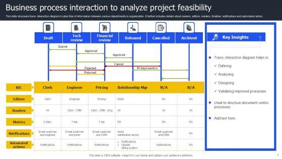 This slide shocases trans interaction diagram to plan flow of information between various departments in organization. It further includes details about owners, editors, readers, timeline, notifications and automated action. Pitch your topic with ease and precision using this Business Process Interaction To Analyze Project Feasibility Topics PDF. This layout presents information on Financial review, Tech review, Released. It is also available for immediate download and adjustment. So, changes can be made in the color, design, graphics or any other component to create a unique layout.