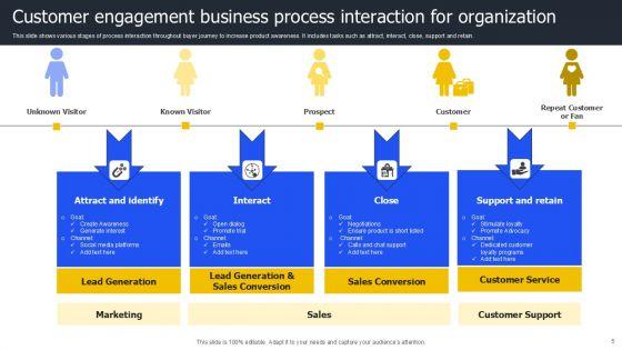 This slide shows various stages of process interaction throughout buyer journey to increase product awareness. It includes tasks such as attract, interact, close, support and retain. Persuade your audience using this Customer Engagement Business Process Interaction For Organization Introduction PDF. This PPT design covers four stages, thus making it a great tool to use. It also caters to a variety of topics including Identify, Interact, Close . Download this PPT design now to present a convincing pitch that not only emphasizes the topic but also showcases your presentation skills.