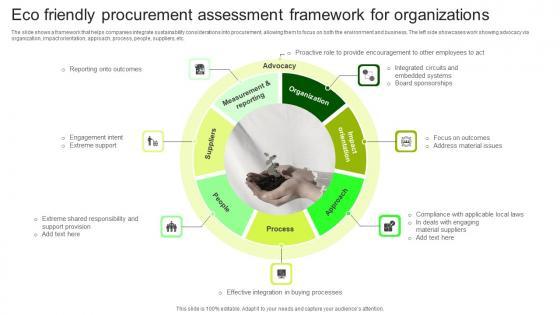 The slide shows a framework that helps companies integrate sustainability considerations into procurement, allowing them to focus on both the environment and business. The left side showcases work showing advocacy via organization, impact orientation, approach, process, people, suppliers, etc.Showcasing this set of slides titled Eco Friendly Procurement Assessment Framework For Organizations Pictures Pdf The topics addressed in these templates are Engagement Intent, Extreme Support, Reporting Onto Outcomes All the content presented in this PPT design is completely editable. Download it and make adjustments in color, background, font etc. as per your unique business setting. The slide shows a framework that helps companies integrate sustainability considerations into procurement, allowing them to focus on both the environment and business. The left side showcases work showing advocacy via organization, impact orientation, approach, process, people, suppliers, etc.