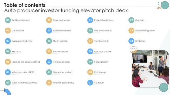 Welcome to our selection of the Table Of Contents Auto Producer Investor Funding Elevator Pitch Deck Ppt Sample. These are designed to help you showcase your creativity and bring your sphere to life. Planning and Innovation are essential for any business that is just starting out. This collection contains the designs that you need for your everyday presentations. All of our PowerPoints are 100 Percent editable, so you can customize them to suit your needs. This multi-purpose template can be used in various situations. Grab these presentation templates today. Our Table Of Contents Auto Producer Investor Funding Elevator Pitch Deck Ppt Sample are topically designed to provide an attractive backdrop to any subject. Use them to look like a presentation pro.