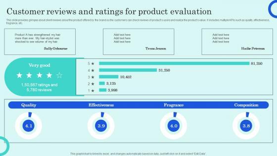 This slide provides glimpse about client reviews about the product offered by the brand so the customers can check reviews of products users and realize the products value. It includes multiple KPIs such as quality, effectiveness, fragrance, etc. Present like a pro with Customer Reviews And Ratings For Product Evaluation Analyzing Customer Adoption Journey Structure Pdf Create beautiful presentations together with your team, using our easy-to-use presentation slides. Share your ideas in real-time and make changes on the fly by downloading our templates. So whether you are in the office, on the go, or in a remote location, you can stay in sync with your team and present your ideas with confidence. With Slidegeeks presentation got a whole lot easier. Grab these presentations today. This slide provides glimpse about client reviews about the product offered by the brand so the customers can check reviews of products users and realize the products value. It includes multiple KPIs such as quality, effectiveness, fragrance, etc.