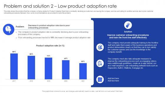 This slide shows the problem that the company is facing related to Product Adoption Rate that is constantly declining as customers are leaving the company services and opting for another services due to poor customer onboarding procedures followed. Also, some recommendations are provided to solve the problem. Formulating a presentation can take up a lot of effort and time, so the content and message should always be the primary focus. The visuals of the PowerPoint can enhance the presenters message, so our Problem And Solution 2 Low Product Adoption Rate PPT Example SS was created to help save time. Instead of worrying about the design, the presenter can concentrate on the message while our designers work on creating the ideal templates for whatever situation is needed. Slidegeeks has experts for everything from amazing designs to valuable content, we have put everything into Problem And Solution 2 Low Product Adoption Rate PPT Example SS This slide shows the problem that the company is facing related to Product Adoption Rate that is constantly declining as customers are leaving the company services and opting for another services due to poor customer onboarding procedures followed. Also, some recommendations are provided to solve the problem.