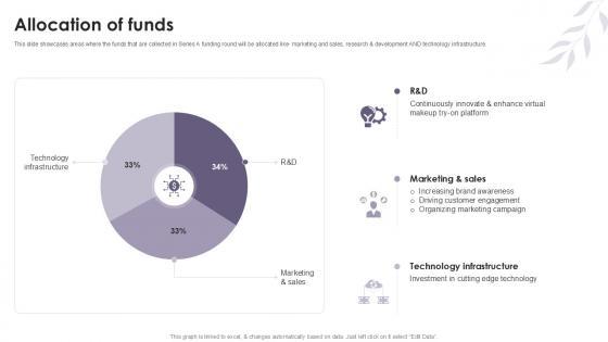 This slide showcases areas where the funds that are collected in Series A funding round will be allocated like marketing and sales, research and development AND technology infrastructure. Find a pre-designed and impeccable Allocation Of Funds Cosmetic Products Platform Investor Ppt Slides. The templates can ace your presentation without additional effort. You can download these easy-to-edit presentation templates to make your presentation stand out from others. So, what are you waiting for Download the template from Slidegeeks today and give a unique touch to your presentation. This slide showcases areas where the funds that are collected in Series A funding round will be allocated like marketing and sales, research and development AND technology infrastructure.