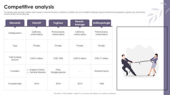 The following slide will assist a fashion retail company to show the investors or audience a complete view of its competitive landscape based on elements like headquarters, business type, total funding amount,founders and founding date. Want to ace your presentation in front of a live audience Our Competitive Analysis Cosmetic Products Platform Investor Ppt Example can help you do that by engaging all the users towards you. Slidegeeks experts have put their efforts and expertise into creating these impeccable powerpoint presentations so that you can communicate your ideas clearly. Moreover, all the templates are customizable, and easy-to-edit and downloadable. Use these for both personal and commercial use. The following slide will assist a fashion retail company to show the investors or audience a complete view of its competitive landscape based on elements like headquarters, business type, total funding amount,founders and founding date.