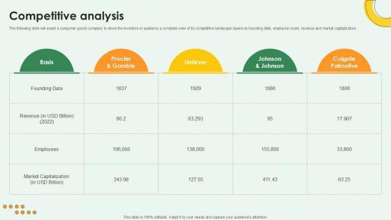 The following slide will assist a consumer goods company to show the investors or audience a complete view of its competitive landscape based on founding date, employee count, revenue and market capitalization. Want to ace your presentation in front of a live audience Our Competitive Analysis FMCG Products Investor Funding Ppt Example can help you do that by engaging all the users towards you. Slidegeeks experts have put their efforts and expertise into creating these impeccable powerpoint presentations so that you can communicate your ideas clearly. Moreover, all the templates are customizable, and easy-to-edit and downloadable. Use these for both personal and commercial use. The following slide will assist a consumer goods company to show the investors or audience a complete view of its competitive landscape based on founding date, employee count, revenue and market capitalization.