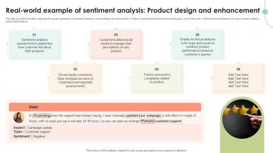 This slide provides information regarding the popular application of sentiment analysis in product design and improvement. It helps in assessing the sentiments and acting as a voice of end user. It allows technical experts to fic bugs or issues related to product performance. Do you have to make sure that everyone on your team knows about any specific topic I yes, then you should give Real World Example Of Sentiment Analysis Product Decoding User Emotions In Depth AI SS V a try. Our experts have put a lot of knowledge and effort into creating this impeccable Real World Example Of Sentiment Analysis Product Decoding User Emotions In Depth AI SS V. You can use this template for your upcoming presentations, as the slides are perfect to represent even the tiniest detail. You can download these templates from the Slidegeeks website and these are easy to edit. So grab these today This slide provides information regarding the popular application of sentiment analysis in product design and improvement. It helps in assessing the sentiments and acting as a voice of end user. It allows technical experts to fic bugs or issues related to product performance.