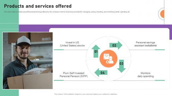 This slide caters to details about financial technology offered by the company in terms of services provided for managing, saving, investing, and monitoring clients spending, etc. Coming up with a presentation necessitates that the majority of the effort goes into the content and the message you intend to convey. The visuals of a PowerPoint presentation can only be effective if it supplements and supports the story that is being told. Keeping this in mind our experts created Products And Services Offered Financial Management Software Capital Raising Deck Icons Pdf to reduce the time that goes into designing the presentation. This way, you can concentrate on the message while our designers take care of providing you with the right template for the situation. This slide caters to details about financial technology offered by the company in terms of services provided for managing, saving, investing, and monitoring clients spending, etc.