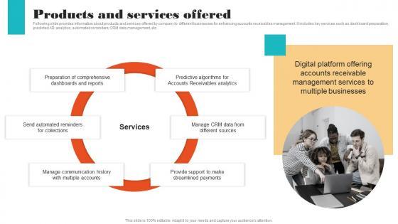 Following slide provides information about products and services offered by company to different businesses for enhancing accounts receivables management. It includes key services such as dashboard preparation, predicted AR analytics, automated reminders, CRM data management, etc. Formulating a presentation can take up a lot of effort and time, so the content and message should always be the primary focus. The visuals of the PowerPoint can enhance the presenters message, so our Products And Services Offered Online Financial Management Funding Elevator Portrait Pdf was created to help save time. Instead of worrying about the design, the presenter can concentrate on the message while our designers work on creating the ideal templates for whatever situation is needed. Slidegeeks has experts for everything from amazing designs to valuable content, we have put everything into Products And Services Offered Online Financial Management Funding Elevator Portrait Pdf Following slide provides information about products and services offered by company to different businesses for enhancing accounts receivables management. It includes key services such as dashboard preparation, predicted AR analytics, automated reminders, CRM data management, etc.