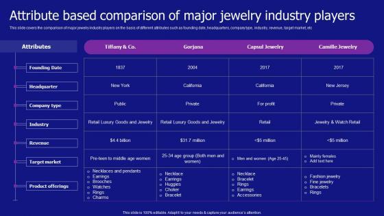This slide covers the comparison of major jewelry industry players on the basis of different attributes such as founding date, headquarters, company type, industry, revenue, target market, etc Create an editable Attribute Based Comparison Of Major Jewelry Industry Jewelry Products Business Guidelines Pdf that communicates your idea and engages your audience. Whether you are presenting a business or an educational presentation, pre-designed presentation templates help save time. Attribute Based Comparison Of Major Jewelry Industry Jewelry Products Business Guidelines Pdf is highly customizable and very easy to edit, covering many different styles from creative to business presentations. Slidegeeks has creative team members who have crafted amazing templates. So, go and get them without any delay. This slide covers the comparison of major jewelry industry players on the basis of different attributes such as founding date, headquarters, company type, industry, revenue, target market, etc