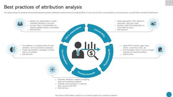 This slide provides key practices aimed at optimizing the practice of attribution analysis to boost marketing efforts. It covers choose KPIs, backend training, connect channels, use automation and talk to stakeholders There are so many reasons you need a Best Practices Of Attribution Analysis Driving Business Success Integrating Product. The first reason is you can not spend time making everything from scratch, Thus, Slidegeeks has made presentation templates for you too. You can easily download these templates from our website easily. This slide provides key practices aimed at optimizing the practice of attribution analysis to boost marketing efforts. It covers choose KPIs, backend training, connect channels, use automation and talk to stakeholders
