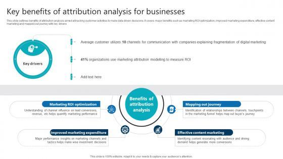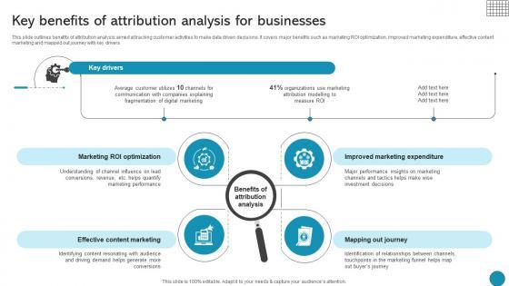 This slide outlines benefits of attribution analysis aimed at tracking customer activities to make data driven decisions. It covers major benefits such as marketing ROI optimization, improved marketing expenditure, effective content marketing and mapped out journey with key drivers Here you can discover an assortment of the finest PowerPoint and Google Slides templates. With these templates, you can create presentations for a variety of purposes while simultaneously providing your audience with an eye-catching visual experience. Download Key Benefits Of Attribution Analysis For Businesses Driving Business Success Integrating Product to deliver an impeccable presentation. These templates will make your job of preparing presentations much quicker, yet still, maintain a high level of quality. Slidegeeks has experienced researchers who prepare these templates and write high-quality content for you. Later on, you can personalize the content by editing the Key Benefits Of Attribution Analysis For Businesses Driving Business Success Integrating Product. This slide outlines benefits of attribution analysis aimed at tracking customer activities to make data driven decisions. It covers major benefits such as marketing ROI optimization, improved marketing expenditure, effective content marketing and mapped out journey with key drivers