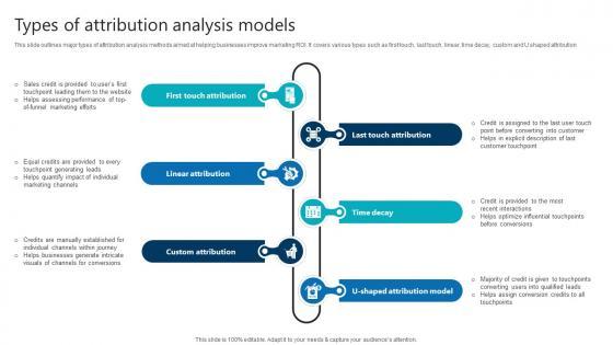 This slide outlines major types of attribution analysis methods aimed at helping businesses improve marketing ROI. It covers various types such as first touch, last touch, linear, time decay, custom and U shaped attribution The Types Of Attribution Analysis Models Product Analytics Implementation Data Analytics V is a compilation of the most recent design trends as a series of slides. It is suitable for any subject or industry presentation, containing attractive visuals and photo spots for businesses to clearly express their messages. This template contains a variety of slides for the user to input data, such as structures to contrast two elements, bullet points, and slides for written information. Slidegeeks is prepared to create an impression. This slide outlines major types of attribution analysis methods aimed at helping businesses improve marketing ROI. It covers various types such as first touch, last touch, linear, time decay, custom and U shaped attribution