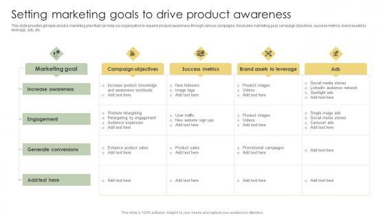This slide provides glimpse about a marketing plan that can help our organization to expand product awareness through various campaigns. It includes marketing goal, campaign objectives, success metrics, brand assets to leverage, ads, etc. Do you have to make sure that everyone on your team knows about any specific topic I yes, then you should give Implementing Client Onboarding Process Setting Marketing Goals To Drive Product Awareness Mockup PDF a try. Our experts have put a lot of knowledge and effort into creating this impeccable Implementing Client Onboarding Process Setting Marketing Goals To Drive Product Awareness Mockup PDF. You can use this template for your upcoming presentations, as the slides are perfect to represent even the tiniest detail. You can download these templates from the Slidegeeks website and these are easy to edit. So grab these today.