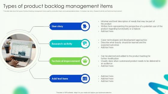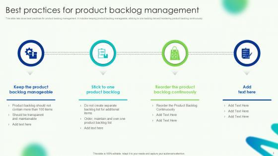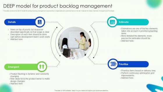 This Product Backlog Management Powerpoint Ppt Template Bundles is designed to help you retain your audiences attention. This content-ready PowerPoint Template enables you to take your audience on a journey and share information in a way that is easier to recall. It helps you highlight the crucial parts of your work so that the audience does not get saddled with information download. This Scrum Activities, Agile Product Management, DEEP Model, Prioritization Criteria-slide PPT Deck comes prepared with the graphs and charts you could need to showcase your information through visuals. You only need to enter your own data in them. Download this editable PowerPoint Theme and walk into that meeting with confidence. Our Product Backlog Management PowerPoint Template Bundle is expertly designed to enhance any topic with a visually appealing backdrop. Use it to deliver a professional and polished presentation effortlessly.