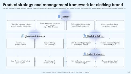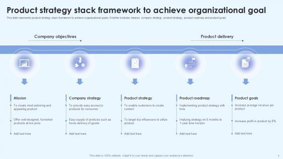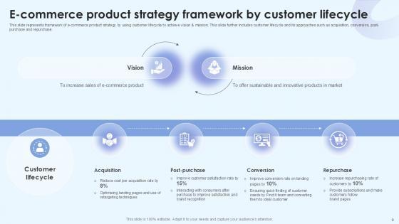 With well-researched insights and carefully-constructed design, this Product Strategy Framework Powerpoint Ppt Template Bundles is all that you need for your next business meeting with clients and win them over. Add your data to graphs, charts, and tables that are already ready to display it with stunning visuals and help your audience recall your work. With this PPT Complete Deck, you will be able to display your knowledge of the subject as well as your skills as a communicator. Share your ideas and make an impact on the audience with this PowerPoint Layout and ensure that you are known as a presentation professional. Download this PPT Template Bundle to create the most interesting presentation anyone has ever seen. Have a look at the Product Strategy Framework PowerPoint PPT presentation, a game-changing tool to assist firms to launch new products. This interactive resource offer approach to developing winning product strategies for varied markets. This PPT, which focuses on e commerce and digital product strategies, goes into key topics such as market analysis, competitive research, target audience identification, and positioning. Discover how to use industry trends and customer insights to create creative and appealing goods that attract to your target audience. Explore the complexities of product development, pricing, distribution, and promotional strategies, all supported by real-world case studies and best practices. Our Product Strategy Framework PPT will help you unlock the potential for extraordinary product success and boost your brands market position.