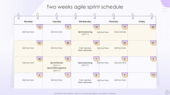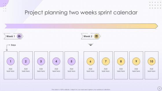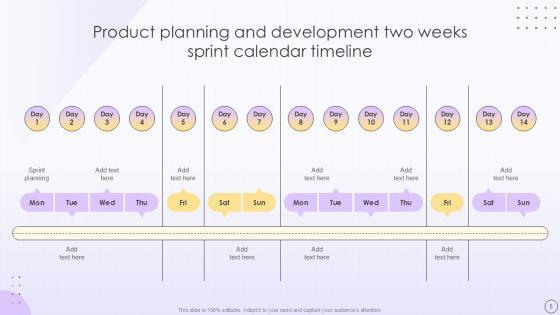 Deploy this comprehensive Two Weeks Sprint Product Planning Development Timeline Business Powerpoint Ppt Template Bundles to analyze how to innovatively carry forward your business with this 2-Week Agile Sprint, Two-Week Development Cycle, 2-Week Scrum Sprint, Biweekly Sprint Plan, 14-Day Sprint Schedule-slide complete deck. There are also options galore if you want to key in your own data in this wonderful presentation, which as always is 100 percent editable and customizable. This template showcases visual elements of the business process to help you understand the many advantages of using presentation templates to spruce up your offerings and be on the top of the game. With the use of this presentation template, you prove yourself to be a champion of the new world of winning clients and the master of pitches that matter. Download now. Our Two-Week Sprint Product Planning Development Timeline templates are thoughtfully designed to offer a visually appealing backdrop for multiple topic. Utilize them to create a professional, polished presentation that clearly outlines your sprint plan and impresses your audience.