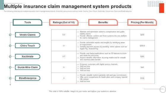 The following slide depicts multiple insurance claim management products. It involves various tools such as Ventiv Claims, Chiro Touch, Xactimate, Guide Wire Claim and EbixEnterprice. Showcasing this set of slides titled Multiple Insurance Claim Management System Products Infographics Pdf The topics addressed in these templates are Ventiv Claims, Chiro Touch, Ebixenterprice All the content presented in this PPT design is completely editable. Download it and make adjustments in color, background, font etc. as per your unique business setting. The following slide depicts multiple insurance claim management products. It involves various tools such as Ventiv Claims, Chiro Touch, Xactimate, Guide Wire Claim and EbixEnterprice.