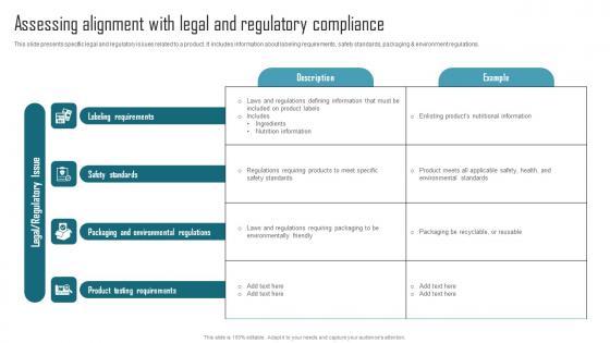 This slide presentsspecific legal and regulatory issues related to a product. It includes information about labeling requirements, safety standards, packaging And environment regulations. There are so many reasons you need a Effective Product Adaptation Assessing Alignment With Legal And Regulatory Compliance Ideas PDF The first reason is you can not spend time making everything from scratch, Thus, Slidegeeks has made presentation templates for you too. You can easily download these templates from our website easily. This slide presentsspecific legal and regulatory issues related to a product. It includes information about labeling requirements, safety standards, packaging And environment regulations.