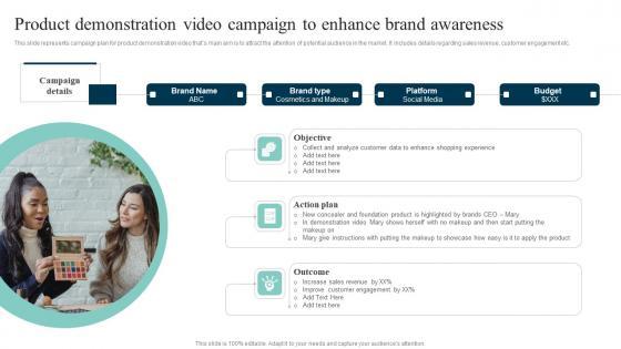 This slide represents campaign plan for product demonstration video thats main aim is to attract the attention of potential audience in the market. It includes details regarding sales revenue, customer engagement etc. If your project calls for a presentation, then Slidegeeks is your go to partner because we have professionally designed, easy to edit templates that are perfect for any presentation. After downloading, you can easily edit Product Demonstration Video Campaign To Enhance Brand Awareness Microsoft PDF and make the changes accordingly. You can rearrange slides or fill them with different images. Check out all the handy templates.