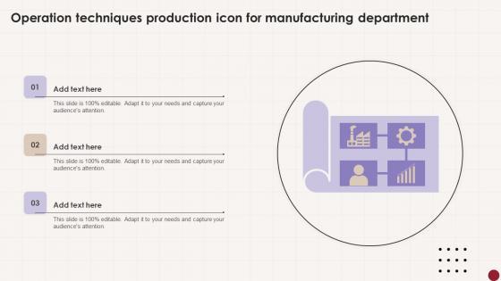 Showcasing this set of slides titled Operation Techniques Production Icon For Manufacturing Department Topics Pdf The topics addressed in these templates are Operation Techniques Production, Icon For Manufacturing Department All the content presented in this PPT design is completely editable. Download it and make adjustments in color, background, font etc. as per your unique business setting. Our Operation Techniques Production Icon For Manufacturing Department Topics Pdf are topically designed to provide an attractive backdrop to any subject. Use them to look like a presentation pro.