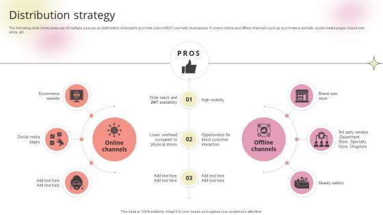 The following slide showcases use of multiple sources as distribution channels to promote sales of B2C cosmetic businesses. It covers online and offline channels such as ecommerce website, social media pages, brand own store, etc.Present like a pro with Distribution Strategy Beauty Product Company Go To Market Strategy GTM SS V. Create beautiful presentations together with your team, using our easy-to-use presentation slides. Share your ideas in real-time and make changes on the fly by downloading our templates. So whether you are in the office, on the go, or in a remote location, you can stay in sync with your team and present your ideas with confidence. With Slidegeeks presentation got a whole lot easier. Grab these presentations today. The following slide showcases use of multiple sources as distribution channels to promote sales of B2C cosmetic businesses. It covers online and offline channels such as ecommerce website, social media pages, brand own store, etc.