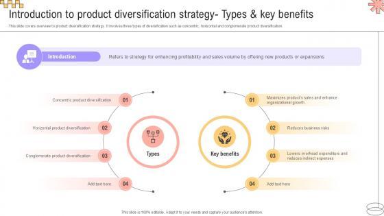This slide covers overview to product diversification strategy. It involves three types of diversification such as concentric, horizontal and conglomerate product diversification. If your project calls for a presentation, then Slidegeeks is your go-to partner because we have professionally designed, easy-to-edit templates that are perfect for any presentation. After downloading, you can easily edit Introduction To Product Diversification Implementing Geographic Extension PPT Sample Strategy SS V and make the changes accordingly. You can rearrange slides or fill them with different images. Check out all the handy templates This slide covers overview to product diversification strategy. It involves three types of diversification such as concentric, horizontal and conglomerate product diversification.