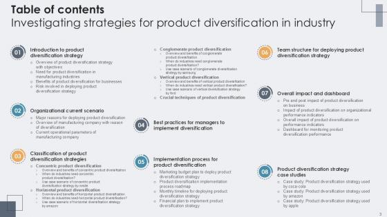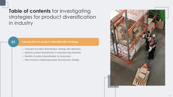 Get a simple yet stunning designed Table Of Contents For Implementing Product Diversification Strategies PPT Powerpoint Strategy SS V. It is the best one to establish the tone in your meetings. It is an excellent way to make your presentations highly effective. So, download this PPT today from Slidegeeks and see the positive impacts. Our easy-to-edit Table Of Contents For Implementing Product Diversification Strategies PPT Powerpoint Strategy SS V can be your go-to option for all upcoming conferences and meetings. So, what are you waiting for Grab this template today. Our Table Of Contents For Implementing Product Diversification Strategies PPT Powerpoint Strategy SS V are topically designed to provide an attractive backdrop to any subject. Use them to look like a presentation pro.