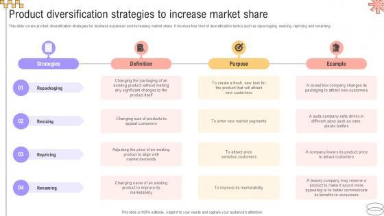 This slide covers product diversification strategies for business expansion and increasing market share. It involves four kind of diversification tactics such as repackaging, resizing, repricing and renaming. This Product Diversification Strategies To Increase Market Share PPT Presentation Strategy SS V from Slidegeeks makes it easy to present information on your topic with precision. It provides customization options, so you can make changes to the colors, design, graphics, or any other component to create a unique layout. It is also available for immediate download, so you can begin using it right away. Slidegeeks has done good research to ensure that you have everything you need to make your presentation stand out. Make a name out there for a brilliant performance. This slide covers product diversification strategies for business expansion and increasing market share. It involves four kind of diversification tactics such as repackaging, resizing, repricing and renaming.