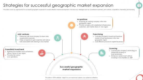 This slide covers key approaches for successful geographic expansion to ensure effective market development. It involves key strategies such as Greenfield investment, joint ventures, acquisitions, franchising and licensing. Want to ace your presentation in front of a live audience Our Strategies For Successful Geographic Implementing Product Diversification PPT Slide Strategy SS V can help you do that by engaging all the users towards you. Slidegeeks experts have put their efforts and expertise into creating these impeccable powerpoint presentations so that you can communicate your ideas clearly. Moreover, all the templates are customizable, and easy-to-edit and downloadable. Use these for both personal and commercial use. This slide covers key approaches for successful geographic expansion to ensure effective market development. It involves key strategies such as Greenfield investment, joint ventures, acquisitions, franchising and licensing.