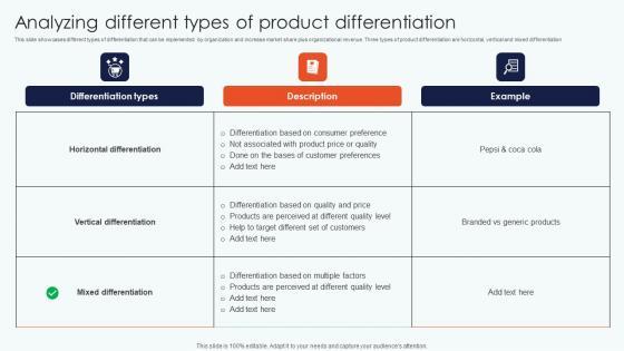 This slide showcases different types of differentiation that can be implemented by organization and increase market share plus organizational revenue. Three types of product differentiation are horizontal, vertical and mixed differentiation Create an editable Analyzing Different Types Product Leveraging Horizontal Vertical Diversification Entering Demonstration Pdf that communicates your idea and engages your audience. Whether you are presenting a business or an educational presentation, pre designed presentation templates help save time. Analyzing Different Types Product Leveraging Horizontal Vertical Diversification Entering Demonstration Pdf is highly customizable and very easy to edit, covering many different styles from creative to business presentations. Slidegeeks has creative team members who have crafted amazing templates. So, go and get them without any delay. This slide showcases different types of differentiation that can be implemented by organization and increase market share plus organizational revenue. Three types of product differentiation are horizontal, vertical and mixed differentiation