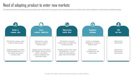 This slide presents the need of adapting product according to local market to enter into overseas market. It includes needs such as, decline in sales, customer satisfaction, market share and competitive advantage. Boost your pitch with our creative Effective Product Adaptation Need Of Adapting Product To Enter New Markets Icons PDF Deliver an awe-inspiring pitch that will mesmerize everyone. Using these presentation templates you will surely catch everyones attention. You can browse the ppts collection on our website. We have researchers who are experts at creating the right content for the templates. So you do not have to invest time in any additional work. Just grab the template now and use them. This slide presents the need of adapting product according to local market to enter into overseas market. It includes needs such as, decline in sales, customer satisfaction, market share and competitive advantage.