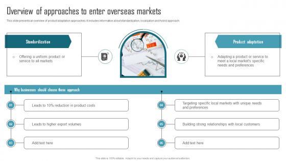 This slide presents an overview of product adaptation approaches. It includes information about standardization, localization and hybrid approach. Slidegeeks is here to make your presentations a breeze with Effective Product Adaptation Overview Of Approaches To Enter Overseas Markets Professional PDF With our easy-to-use and customizable templates, you can focus on delivering your ideas rather than worrying about formatting. With a variety of designs to choose from, you are sure to find one that suits your needs. And with animations and unique photos, illustrations, and fonts, you can make your presentation pop. So whether you are giving a sales pitch or presenting to the board, make sure to check out Slidegeeks first This slide presents an overview of product adaptation approaches. It includes information about standardization, localization and hybrid approach.