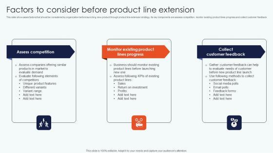 This slide showcases factors that should be considered by organization before launching new product through product line extension strategy. Its key components are assess competition. monitor existing product lines progress and collect customer feedback Crafting an eye catching presentation has never been more straightforward. Let your presentation shine with this tasteful yet straightforward Factors Consider Before Product Leveraging Horizontal Vertical Diversification Entering Mockup Pdf template. It offers a minimalistic and classy look that is great for making a statement. The colors have been employed intelligently to add a bit of playfulness while still remaining professional. Construct the ideal Factors Consider Before Product Leveraging Horizontal Vertical Diversification Entering Mockup Pdf that effortlessly grabs the attention of your audience Begin now and be certain to wow your customers This slide showcases factors that should be considered by organization before launching new product through product line extension strategy. Its key components are assess competition. monitor existing product lines progress and collect customer feedback